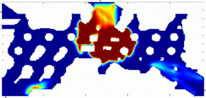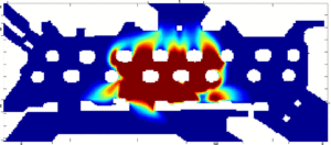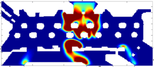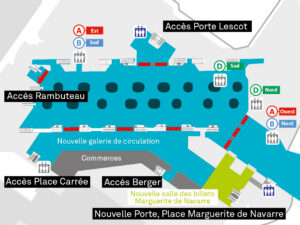Ces deux illustrations modélisent la dynamique d’un groupe de personnes (groupe en rouge) qui se trouvent à la station Les Halles à Paris et qui essaient de sortir de la station d’une manière optimale mais en tenant compte des effets de congestions. Deux cas sont considérés :